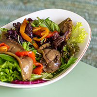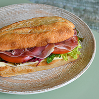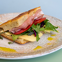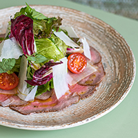 Mortadella di Bologna con pistacchio pomodoro mezclun